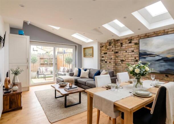 Vintage hardwood flooring extends through the generous ground floor living space: the front sitting room has a feature fireplace and there is an impressive 29ft kitchen, open plan to both dining and seating areas. Sliding doors provide access out to the low maintenance rear garden. On the first floor, two double bedrooms have bespoke wardrobes and share a family bathroom, whilst the principal bedroom occupying the second floor has an en suite bathroom with separate shower. NB. Library photos used.