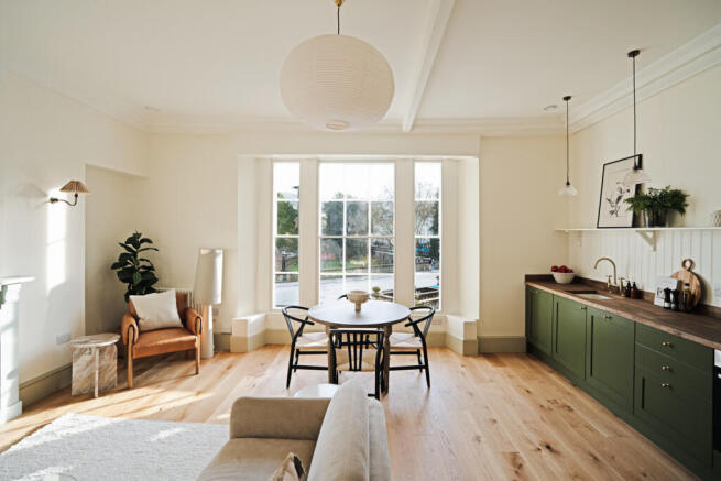 The primary living areas, arranged in an open-plan layout, are orientated due south-east, with an expansive sash window inviting an exceptional quality of natural light throughout the course of the day. Along one side of the room is a bespoke kitchen in deep, forest-green, finished with dark-stained oak worktops. The layout of the room is versatile, with a broad cast-iron fireplace forming a characteristic period centrepiece.