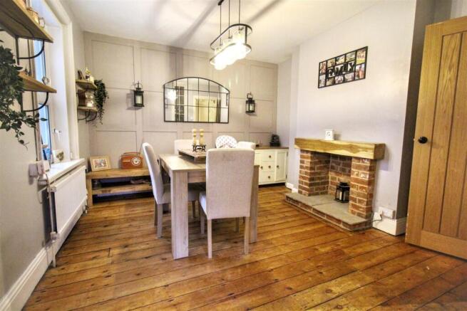 Dining Room - Double glazed bay window to rear aspect, wooden flooring, brick fireplace (currently boarded), radiator, open to:-