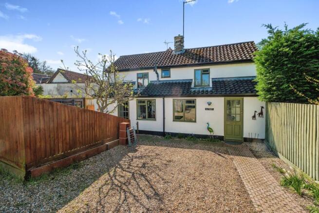 To the front of the property lies a shingle driveway with parking for two cars. There is a brick path leading to the front door. A wooden fence and gate leading into a courtyard garden, which is laid to paving and shingle with raised wooden sleeper borders full of mature plants. Wooden storage shed. Storage area to side of property.