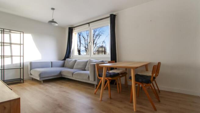 Entry to the bright and spacious communal hallway. The property is located on the first floor and the internal front door opens into the hallway, which leads to all rooms. The spacious living dining room has a modern feel and is wonderfully bright and airy thanks to the well sized windows. This room has both lounge and dining furniture, providing a fantastic space for modern living and entertaining. The kitchen is just off the living room is well laid out with modern base and wall units, oven, hob, and extractor fan, and a washing machine, and fridge/freezer.