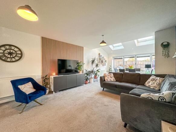 An elegant entrance hall greets you into the property, setting a precedent for the accommodation to follow and leading through to a substantial fitted kitchen which is complete with a range of stylish fitted base and wall units, complementary worktops providing plentiful surface space, and a selection of sleek integrated appliances. The centre island incorporates a breakfast bar, ideal for casual dining and cooking in company. The kitchen flows seamlessly into a living space which then effortlessly transitions into a dining area, creating the ultimate open plan social setting for spending quality time with family and entertaining on a grander scale. The lounge has been finished in a fresh contemporary décor featuring plush carpeting and tasteful wood wall panelling, whilst the dining area enjoys bi-fold doors providing seamless access out to the garden and skylights above flooding the space with natural light. Concluding the extensive ground floor is a well-equipped utility room and convenient WC.