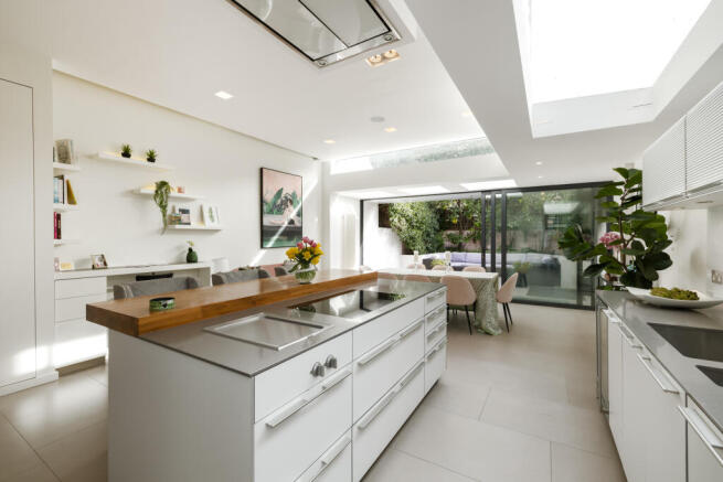 Engineered hardwood flooring runs throughout the principal spaces, complemented by extensive bespoke joinery in walnut and oak. These custom elements provide both visual continuity and generous integrated storage, while maintaining a clean, uncluttered feel. The house is fully future-proofed, with Category 7 cabling and a Sonos sound system installed across the ground and first floors, including the garden, alongside a dedicated 5.1 surround-sound cinema room discreetly integrated into the design.