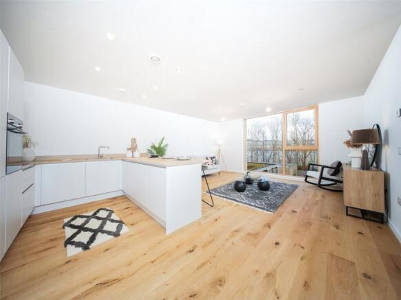 The heart of the apartment is the open-plan living, kitchen and dining area, bathed in natural light thanks to its east facing aspect The kitchen is kitted out with integrated appliances, versatile breakfast bar and smart storage, keeping everything streamlined and practical.