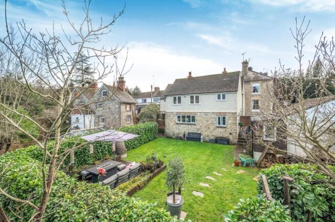 Outside, the gardens unfold as a tranquil and slightly whimsical oasis, offering far reaching views across the valley and a variety of seating areas from which to enjoy the changing light and surrounding nature. Mature hedging and specimen trees frame the boundaries, creating privacy and a strong sense of seclusion, while two substantial sheds provide useful storage. To the rear, a charming secret garden sits beside the Loose Stream, an idyllic place to linger with a morning coffee or an evening glass of wine, as ducks drift past and the water gently meanders by.