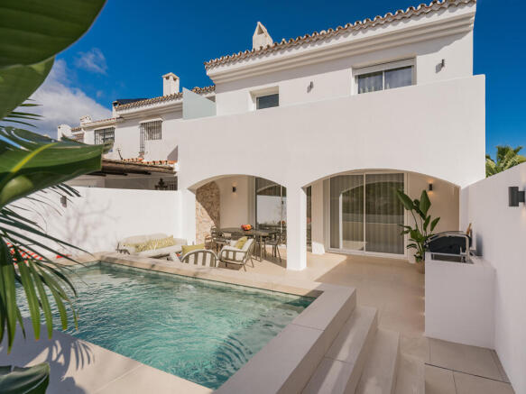 Located just 600 metres, or an easy 8-minute walk, from the beach, this elegant semi-detached house is set within a gated community in the highly sought-after area of San Pedro Beach. Perfectly positioned for year-round living or as a holiday home, the property enjoys walking-distance access to cafés, supermarkets, international schools, the beach promenade, and San Pedro’s vibrant selection of new beachfront restaurants, beach clubs, and traditional chiringuitos. The boutique residential community offers landscaped gardens, a large communal swimming pool, a padel court, and private resident parking, creating a peaceful and family-friendly environment while remaining close to Puerto Banús, the Golden Mile, and Estepona.