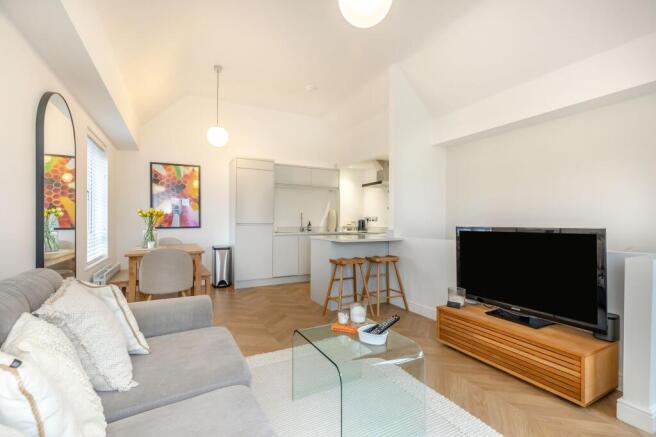 Set over two beautifully designed floors, the property immediately impresses with its sense of space and light, culminating in a breathtaking open plan living area on the top floor. Here, vaulted ceilings create a dramatic effect, perfectly complemented by an opulent refitted kitchen featuring high gloss units, high-end integrated appliances, and solid quartz work surfaces with matching breakfast bar (all designed for both style and functionality). The living and dining zones flow seamlessly together, providing an impressive setting for entertaining guests or simply relaxing in comfort.