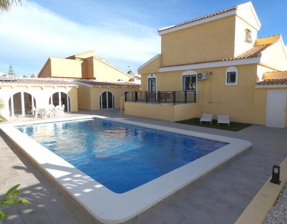 The new swimming pool is beautifully positioned at the rear of the villa, creating a striking impression and forming the focal point of the outdoor living space. Fully tiled for low maintenance, the impressive 10x5 pool offers generous room for both leisurely swims and family fun. Solar panels provide the power for the pool heater. To the right of the pool, there are two enclosed brick-built extensions. Both feature arched windows that overlook the pool, creating a bright and inviting space with direct views of the pool area