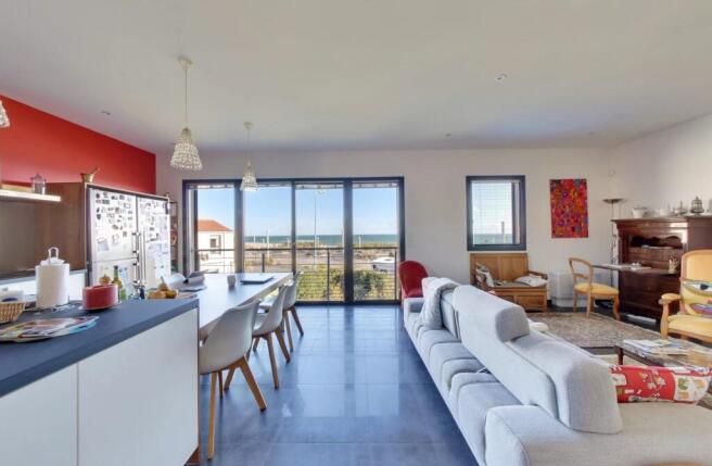 Upstairs, the main living area, bathed in natural light, offers generous volumes. The sea reveals itself through the wide picture window, while the adjoining terrace creates a seamless continuity between indoor and outdoor spaces. A wood-burning stove adds a soft, warm atmosphere. A suite also completes this level.