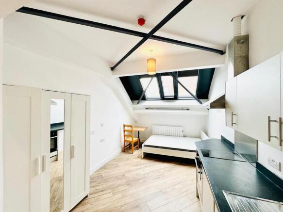 Studio - Keypad entry allows you access in to the building, with large windows all the way through the communal areas are bright and spacious. The studio is located on the first floor. Benefitting from stunning skylights all the way across the studio is flooded with natural light. The studio comes furnished with double bed, mattress, large wardrobe, dining table and two chairs.