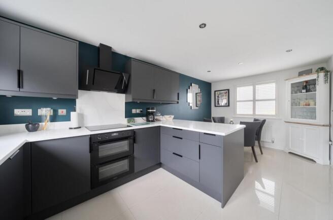 KITCHEN / DINING ROOM: 18’5 maximum x 11’11 maximum. A beautifully presented open-plan living space enjoying a light dual aspect with double glazed window to the front boasting a sunny south westerly aspect, fitted plantation shutters, double glazed window to the rear overlooks the rear garden, radiator, ceramic floor tiles, moulded skirting boards and architraves, inset feature ceiling lighting, an extensive range of stylish contemporary replacement kitchen units comprising solid quartz worksurface and surrounds, inset stainless steel one and a half sink bowl, mixer tap over, inset Bosch electric induction hob with quartz splashback, electric oven under, a range of drawers and cupboards under, ambient plinth lighting, integrated dishwasher, integrated fridge and freezer, a range of matching wall mounted cupboard with under unit lighting, wall mounted cooker hood extractor fan. Panel door leads to