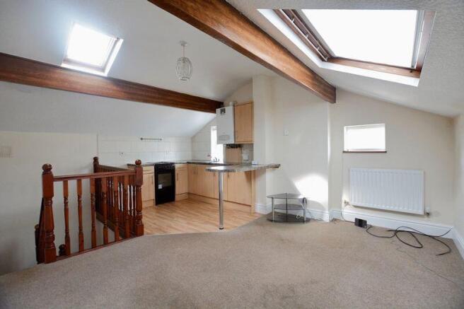 Open plan Lounge and Kitchen with connections for satellite TV and telephone point, built in storage cupboard and single panel radiator. The lounge is open to the kitchen, which is a modern fitted kitchen incorporating a range of wall and base units with a complimentary worktop and matching breakfast bar. Freestanding electric cooker, space for fridge/freezer, stainless steel sink with mixer tap and drainer and part tiled walls. There is also exposed ceiling beams and two double glazed windows.