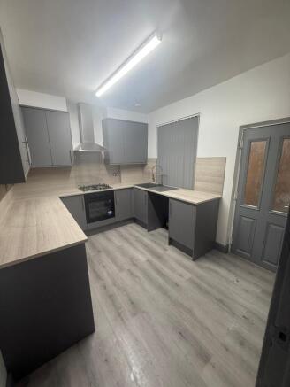 Range of fitted wall and base units with counter tops and matching splashback, gas hob, electric oven, extractor fan and heated towel rail, laminate flooring.