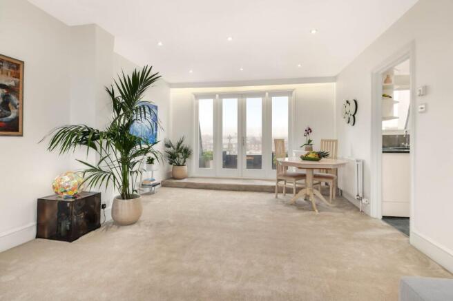 a well-presented stucco-fronted building. This three-bedroom duplex boasts an abundance of natural light, privacy and open views across Kensington. The apartment has a long 953-year lease which includes share of freehold. The upper floor is designed for entertaining with a bright open plan reception room / dining area (with south facing natural light) with adjoining kitchen. The reception room flows out on to a private terrace, ideal for outdoor dining. A unique spiral staircase connects to the sleeping accomodation below. A generous principal suite with en-suite bathroom, while two further bedrooms share a separate family bathroom. The family bathroom opens directly on to the second terrace. There is ample built in storage throughout the property.