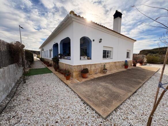 On a larger than average, low maintenance, walled and fenced plot, the villa has wide reaching views of open countryside and the mountains beyond. Both pedestrian and vehicle gates give access to the plot, which in the main is graveled and paved and planted with mature native plants, flowering shrubs and fruit trees. A path leads to the porch which covers the front door, spacious enough for a table and chairs. To the left of the villa is also the integral single garage, enough space for a car and fitted with work benches and benefiting from electricity.