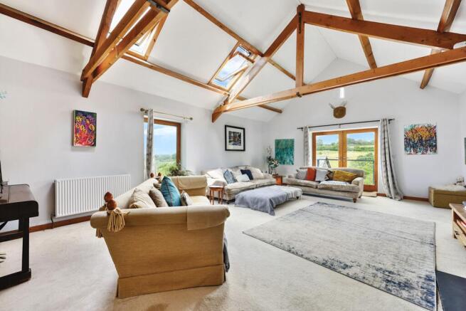 From here, three doors open to inviting reception rooms. The first beckons you into a generous 24-foot reception, complete with a practical wood-burning stove resting on a slate hearth, and triple-aspect windows showcasing the untouched rural landscape. At the far end of the room, French doors lead to an L-shaped balcony, a perfect retreat for savouring the beauty of nature. The room is spacious and filled with light, boasting an A-framed beamed ceiling and a skylight that further enhances its airy ambiance.