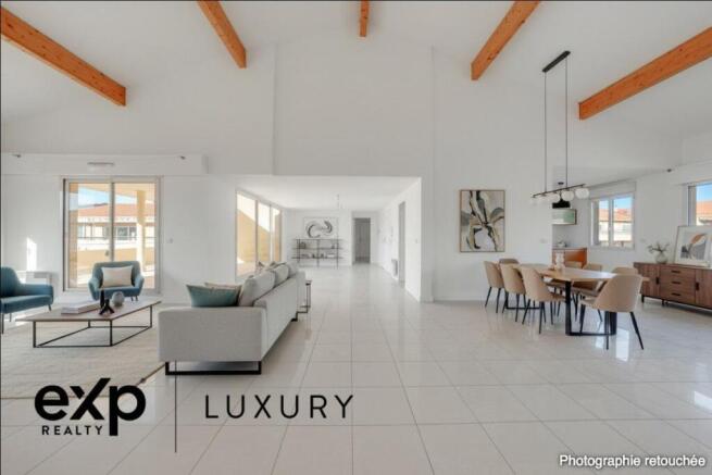 Access is directly via a private elevator opening into the apartment. Bright and dual-aspect, the property stands out for its generous volumes and remarkable ceiling height. The living area, a true cathedral-style space of over 100 sqm, opens extensively onto the outdoors through large picture windows leading to the terrace. The semi-open kitchen blends harmoniously into this warm and contemporary setting.