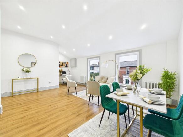 The spacious open plan living area boasts a vaulted ceilings with inset spotlights, two large sash windows to the front aspect overlooking St Marys Church, two traditional style radiators and LVT flooring.