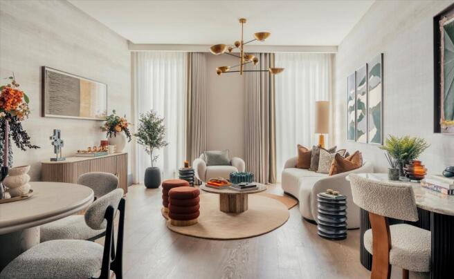 The interior design draws inspiration from its aspect towards Hyde Park, creating an interior that feels warm, inviting and calming. A palette of soft, earthy tones are complemented by cosy textures such as layered fabrics, natural fibres and refined timber accents. Elegant touches of stone, metallic finishes and considered styling elements add a subtle layer of sophistication. Curved upholstery and modern furniture create a welcoming atmosphere without distracting from the views outside, while layered lighting introduces warmth and depth across the space. Overall, the apartment combines understated luxury with a sense of tranquillity, offering a serene and timeless home that feels connected to its natural surroundings and complements the architectural prestige and design details of The Bryanston itself.