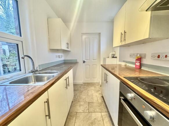 Modern range of wall and base units, electric hob & electric oven with extractor, space for W/M, space for F/F, tiled floor, window to the side aspect.