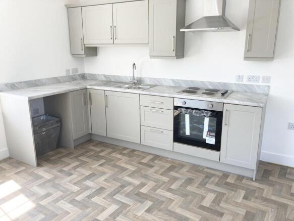 The open plan kitchen/ living room consist of wall and base units, electric oven and hob, space for fridge freezer and plumbing for washing machine.