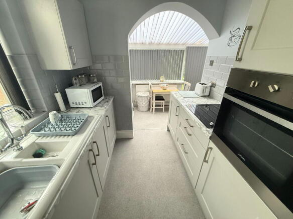 A dual aspect room with double glazed Upvc sliding patio doors leading out to the rear garden and double glazed Upvc windows to the rear and side. Range of base units incorporating worksurfaces with plumbing and space for washing machine underneath. Door to walk in cupboard and opening to the Kitchen.