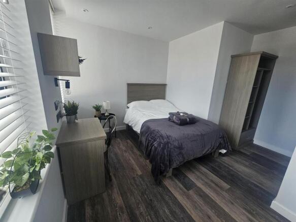 The bedroom area is provided with a small double bed, wardrobe, bedside table, desk and chair.