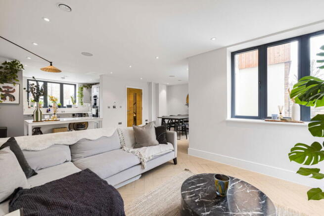 Accommodation comprises entrance hall with access to guest WC, leading into the bright and spacious open plan reception/kitchen/diner with direct access onto the garden and ample space for relaxing, entertaining and dining. To the front of the property, the beautifully appointed kitchen area comprises a modern range of matching wall and base units with work surfaces incorporating inset sink unit, gas hob with overhead extractor, double wall mounted oven, and further integrated appliances. The lower level offers a further inviting family/cinema room with retractable skylight window, utility room and double bedroom with adjacent shower. To the first floor, there are three additional well proportioned bedrooms - one en-suite - plus a family bathroom.