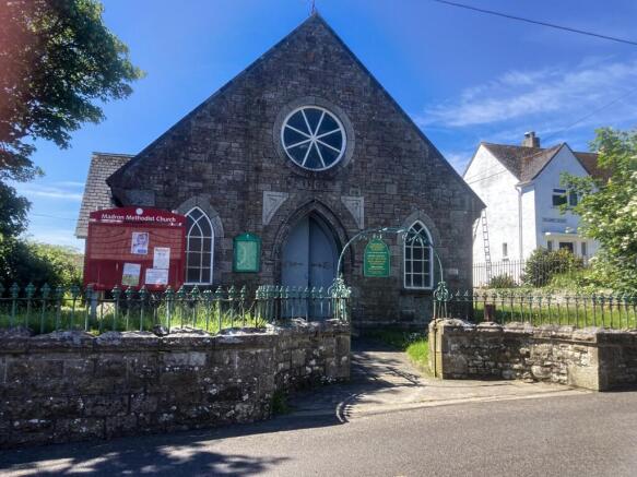 To the front of the property is low granite wall with rough iron railings above, including central pedestrian gate (no vehicle access), white concrete path leads to the double timber entrance doors, small grass areas to either side and the footpath continues around the east elevation to the ramp access leading to the side door into the Sunday School room. Further grass strip extends beyond the east side of the Sunday School and is approximately 1.45 metres. Grassed area continues to the rear, where the boundaries marked by a bonded stone wall are 1 metre high. At the rear of Madron Methodist Church is a further area, situated within this area is a PVC oil tank, set within galvanized steel mesh. On the east side of the boundary of the property, is enclosed by a very low stone wall with evidence of former iron railings, which have long been removed