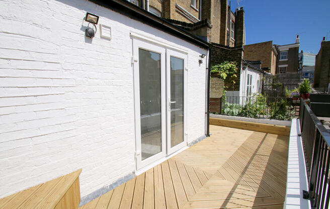 To the rear is a generous double bedroom finished with high-quality carpeting, an electric Velux skylight with integrated blackout blind, and French doors opening directly onto a wooden-decked private roof terrace — perfect for outdoor dining or relaxing.
