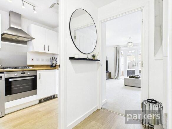 The internal layout is particularly well considered. The living and dining room enjoys a pleasant outlook over the private rear garden, with patio doors opening directly onto the terrace. The kitchen is neatly arranged and complements the contemporary feel of the home, while the welcoming hall includes a cloakroom for added convenience.