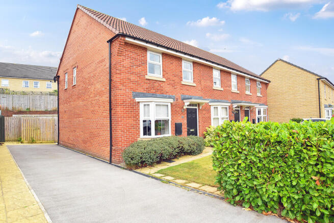 The property offers modern and well-planned accommodation arranged over two floors. The ground floor includes a bay-fronted living room, spacious dining kitchen with French doors to the garden, and a guest WC. Upstairs there are three bedrooms, including a main bedroom with en-suite shower room, together with a modern house bathroom. Outside there are neat front lawns, a driveway providing parking for several vehicles, and private south-facing rear gardens with patio and lawn.