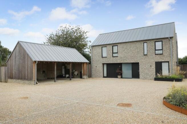 Externally, the façade is defined by striking exposed knapped flintwork, beautifully contrasted by powder-coated aluminum-framed windows and doors, offering a bold yet refined aesthetic.