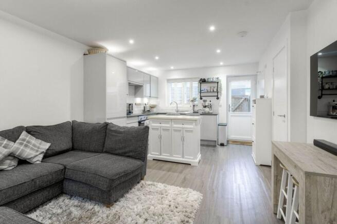 To the rear, the kitchen area showcases a sleek and contemporary finish, with stylish cabinetry, ample cupboard space, and integrated appliances designed to compliment modern living. The addition of a breakfast bar not only provides further storage but also creates the perfect spot for casual dining, morning coffee, or entertaining guests. A window overlooking the garden and a door providing direct outdoor access further enhance the sense of openness and connection between inside and out.