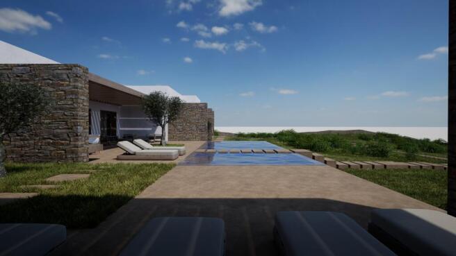 Stepping outside, the expansive terrace reveals a magnificent view of the Aegean Sea, especially during sunset time. Elegant loungers surround the swimming pool, while the dining area and adjacent lounge set the scene for unforgettable evening meals and cocktails. Additional outdoor spots offer the choice between uninterrupted sea vistas or serene landscape views.