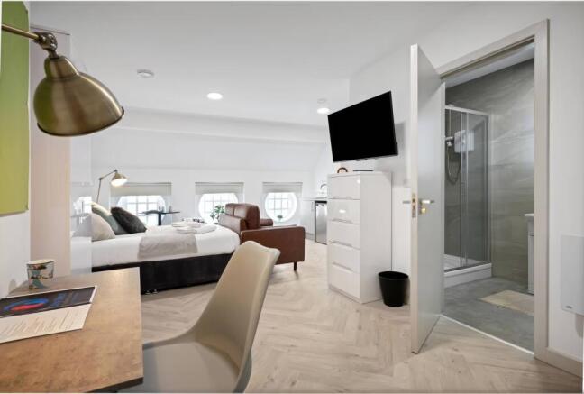 The studio is fully furnished and includes a comfortable double bed, ample storage, a dedicated study area, and a modern kitchenette with integrated appliances. The en-suite bathroom is finished to a high standard, and the layout has been thoughtfully arranged to maximise both space and comfort.