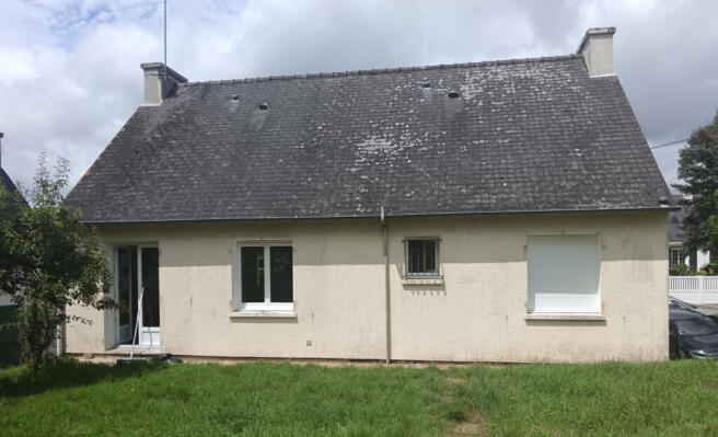 Built in the 1980s, it offers a large, bright living room with a kitchenette, thanks to its French doors that open directly onto the garden. A hallway leads to a toilet, a shower room, and three bedrooms.