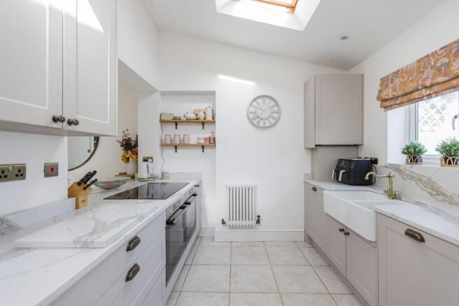 To the back is a modern, spacious kitchen-diner. It’s immaculately presented with a dreamy skylight, brass detailing and quartz worktops, making it the perfect hub to socialise and cook up your favourite dishes. There’s even an enclosed porch to keep tiny feet and muddy paws away from that freshly mopped floor, the downstairs loo keeps things nice and practical too.