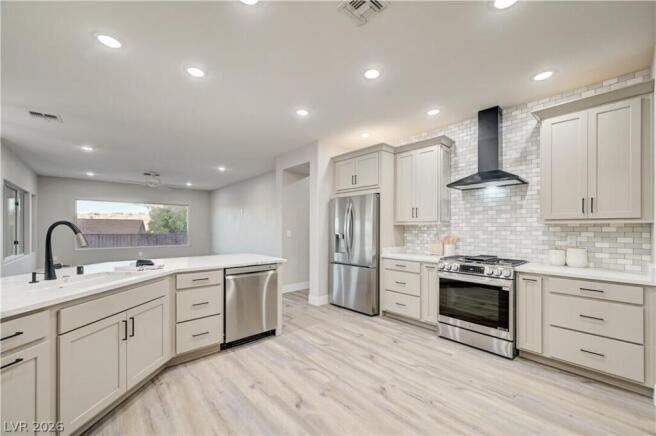 Elevated living in this completely renovated "Arlington" floor plan offering 3 bds, 2 baths, & a level of quality & design that is apparent from the moment you arrive. Modern upgrades, breathtaking views from both the front & back, & a premier location within a vibrant 55+ community. Showcasing luxury vinyl plank flooring throughout, new paint and oversized baseboards for a clean modern finish. The fully reimagined chef's kitchen features all-new cabinetry, elegant quartz countertops, stainless steel appliances, & a sleek microwave drawer. A newly added walk-in pantry enhances & maximizes storage space. Primary suite is complete with a spa-inspired bathroom inc. dual vanity & an oversized walk-in tile shower. Laundry room adds convenience w/ built-in cabinetry & a utility sink. Fully fenced outdoor space w/ stunning STRIP VIEWS that can be enjoyed from the covered patio or family room. Every detail of this home was thoughtfully & intentionally renovated w/ quality & longevity in mind.
