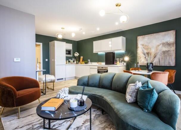 Welcome 'The Elder' - A 782 sq ft two-bedroom apartment on the second floor at Southall Grove. It features an open-plan kitchen, living, and dining area with an L-shaped kitchen, Quartz 'Salt & Pepper' worktops, integrated appliances, and modern cabinetry. Amtico Spacia 'Sun Bleached Oak' flooring runs throughout the living space and has lots of natural light.