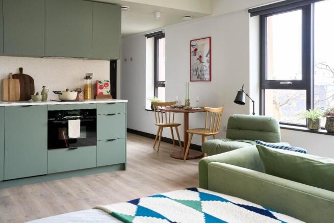 Each large studio flat (this is layout PS05) comes with a private wet-room bathroom with high pressure rainfall shower, built in mirrored storage and designer bathroom suite. A double bed with upholstered headboard, comfy mattress, fitted wardrobes and lift up under-bed storage. The living space has wooden floors throughout, includes curtains, TV unit and comfy Sofa. There is also a kitchen with built in Bosch fridge, freezer, dishwasher, microwave, oven & induction hob.