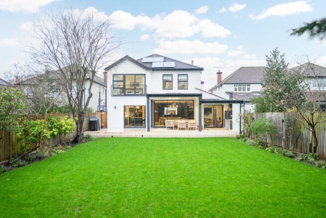 The rear garden has been beautifully designed to create a seamless extension of the home, offering an exceptional space for both relaxation and entertaining. A generous covered terrace sits directly off the main living area, providing an all-weather outdoor room complete with recessed lighting and a built-in outdoor kitchen, barbecue and audio speakers. Beyond the terrace, the garden opens onto a large, level lawn with well-established planting and mature borders.