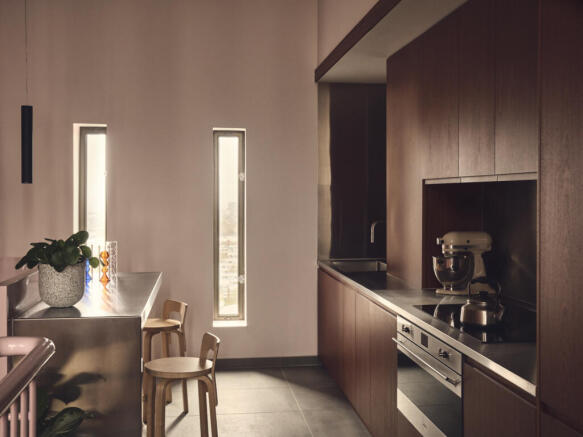 Located on the 21st floor of Balfron Tower, this two-bedroom apartment has well-proportioned rooms, underfloor heating and a Balcony with built-in planter and skyline views. This space, designed by Ab Rogers, is part of a considered retrofit of this east London landmark. Its palette draws on research into the Goldfinger archives and each fixture has been carefully selected for style and longevity It’s fully furnished with bespoke pieces designed for Balfron Tower, including a deep-filled sofa with a midcentury silhouette, a cocooning armchair upholstered in cosy bouclé, a coffee table with terrazzo top, a sideboard and a steel bookshelf. The dining area features a contemporary table with tapered legs and enough curved-back chairs for the whole gang, while all bedrooms include a double ottoman storage bed with upholstered headboard, plus a solid wood bedside table and chest of drawers.