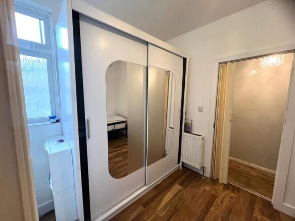 The flat features a separate kitchen equipped with an electric hob, washing machine, and mini fridge. A very large cupboard provides excellent storage space.