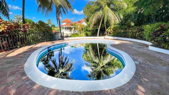 Outdoor Oasis: A large swimming pool, perfect for relaxing or entertaining, surrounded by lush tropical landscaping.