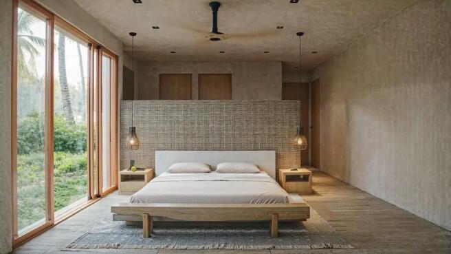 interior materials include natural travertine marble, beige granite countertops, and tropical hardwood cabinetry, paired with elegant touches like yute-accented walls and matte black fixtures. Every detail is selected to reflect the surrounding landscape and promote a sense of calm and connection.