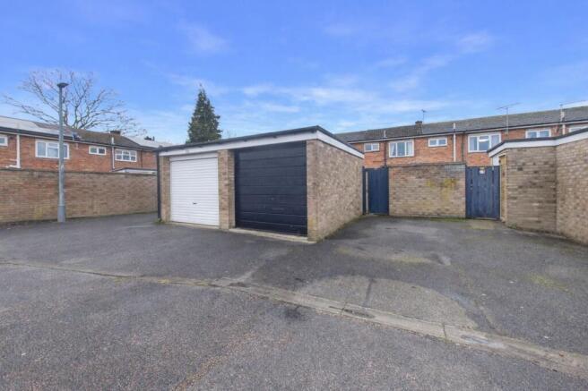 The property includes a single garage with an up-and-over door, providing rear access to a brick-built store. There is a separate door from the store leading directly into the garden. Off-road parking is available for up to three vehicles.