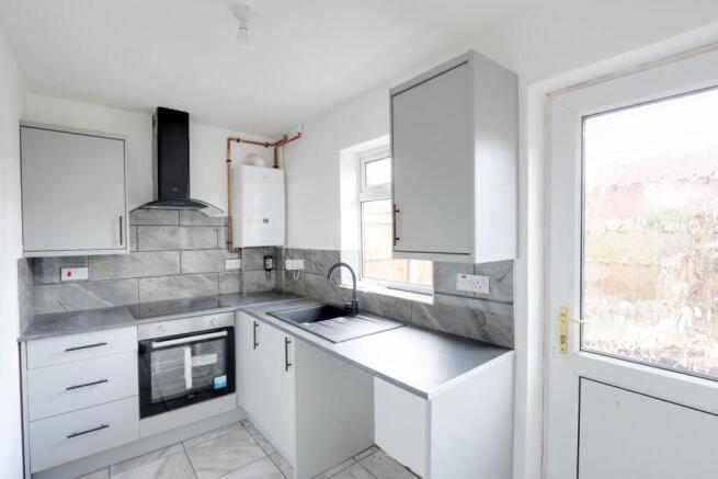 Tiled flooring & around worktops, new electric oven, induction hob & extractor fan. Space for tenants' own washing machine & fridge/freezer. Door to back garden.