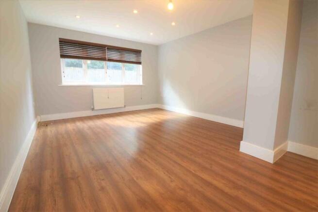 The accommodation is generously sized and features a modern fitted kitchen with high-gloss white units, integrated appliances and spotlights, a contemporary bathroom with a three-piece suite, and a spacious lounge with bright neutral décor, wood flooring and views over the extensive garden. The property offers a well-proportioned double bedroom.