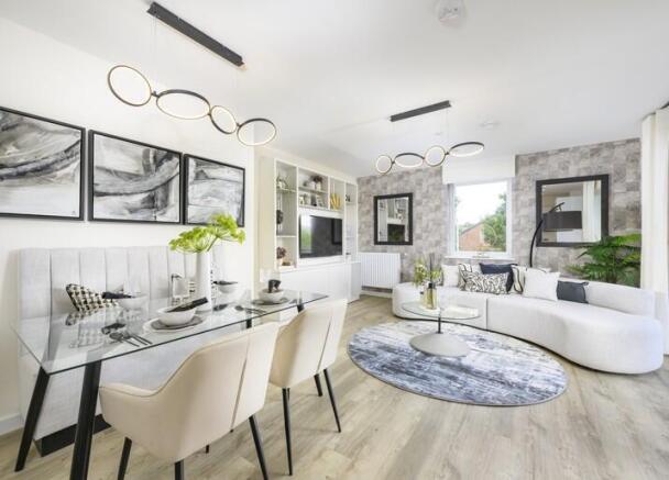 As you enter the open plan kitchen/living/dining room, you're greeted by a large L-shaped kitchen, designed to blend modern style with everyday functionality. The kitchen is equipped with sleek gloss handleless cabinetry, Quartz 'Salt and Pepper' worktops, and fully integrated appliances; creating an ideal space for both cooking and entertaining.